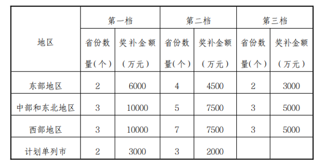 第十六條 中央財(cái)政采取與績(jī)效掛鉤的方式對(duì)示范區(qū)分檔獎(jiǎng)補(bǔ),按各省績(jī)效排名從高到低確定獎(jiǎng)補(bǔ)檔次,具體各檔位省份數(shù)量、獎(jiǎng)補(bǔ)金額分布如下。